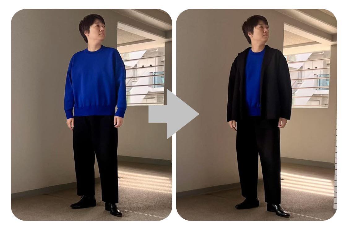 例えば、ブルーのトップスに黒のアウターを重ねるだけでも印象は大きく変わります。